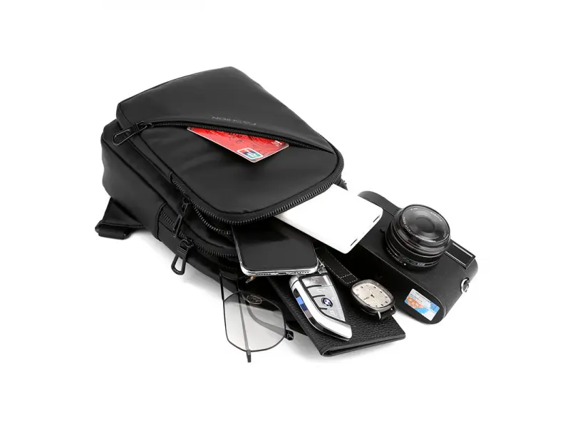 Стилна мъжка чанта за през гърди - Мъжка чанта, която може да се носи през гърди, рамо или гръб тип раница. - Едно основно отделение с цип. - Малък вътрешен джоб без цип. - Два предни джоба с цип. - Регулираща се презрамка.