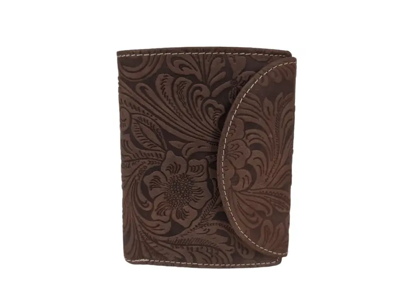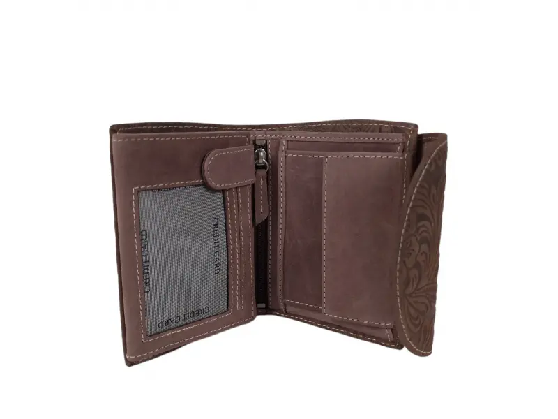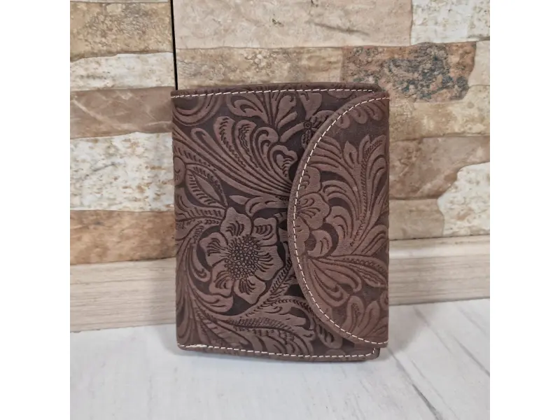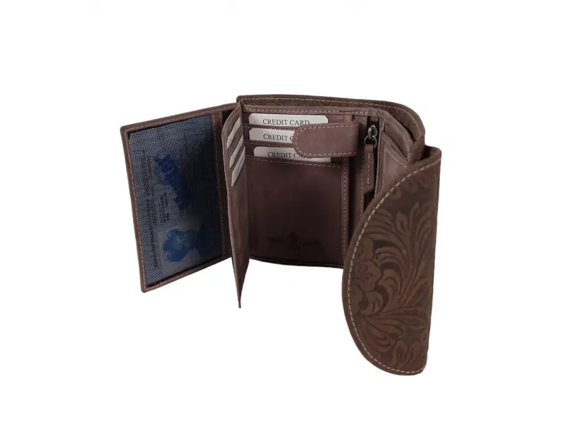 Уникално дамско портмоне - Дамско портмоне от естествена кожа. - Закопчаване с копче тик-так. - Отделения за карти. - Отделения за банкноти. - Вътрешен монетник с копче. - Вътрешен джоб с цип. - Заден джоб с цип.