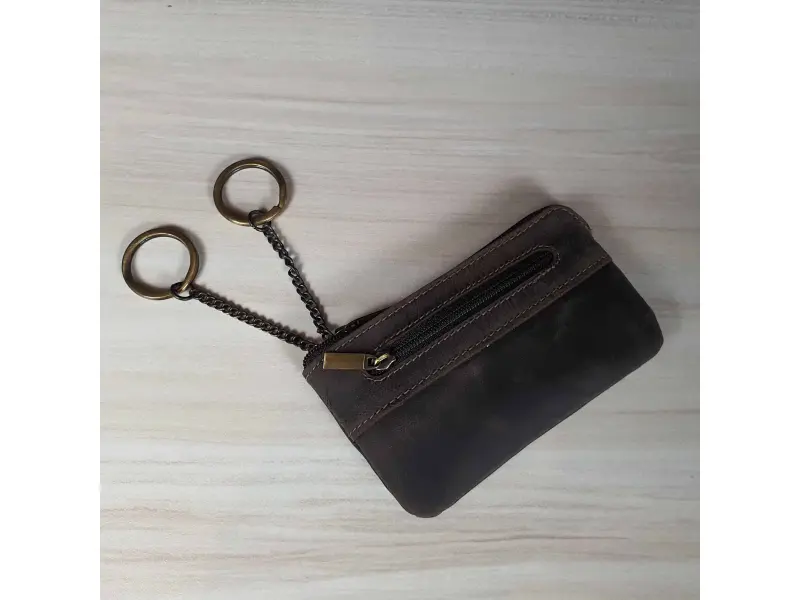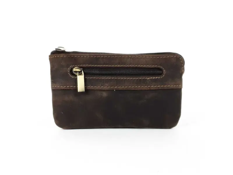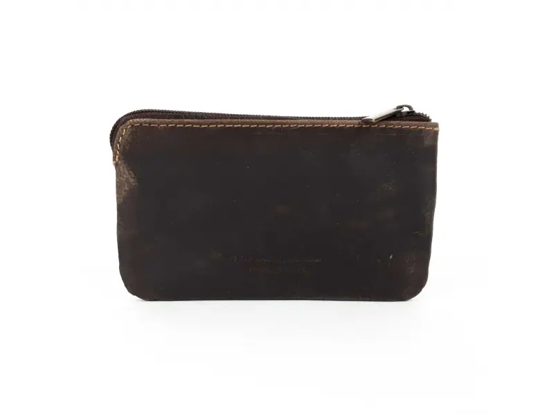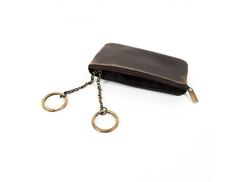 Качествен ключодържател - портмоне от естествена телешка кожа - Hunter обработка. Компактно портмоне с основно отделение с цип, място за банкноти, монети и две халки за ключове, преден джоб с цип.