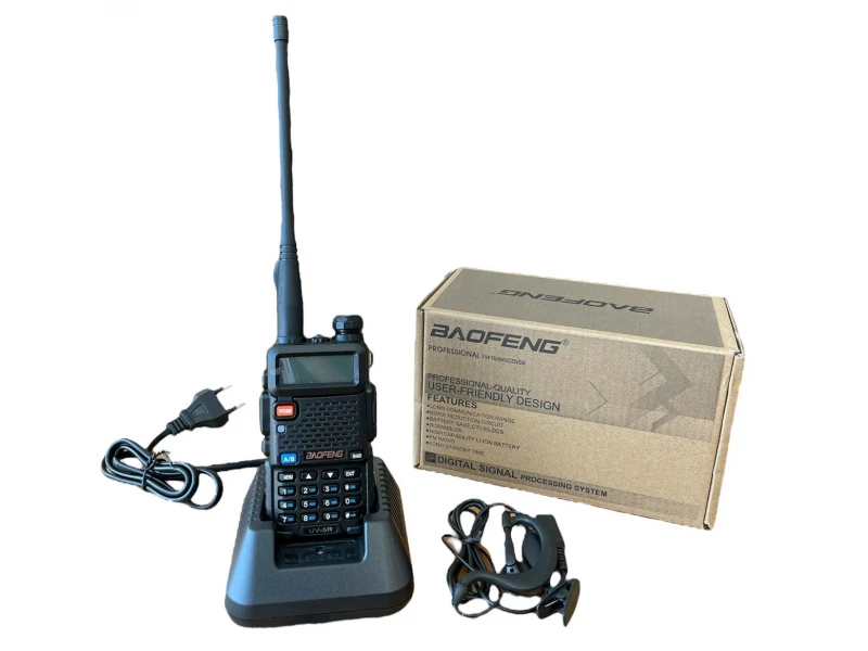 Мощна радиостанция Baofeng UV-5R 8W с VHF-UHF честоти ще покрие обхват до 10 км в идеални условия. Високите (136 – 174MHz) и ултрависоките (400 – 480MHz) честоти ще Ви осигурят надеждна комуникация, независимо дали се намирате в гъста гора или в закрито помещение. Можете да изберете до 128 канала и да програмирате радиостанцията, чрез компютър или ръчно. Имате възможност да изберете изходящата мощност в зависимост от това, какъв периметър искате да обхванете. Ако групата е наблизо може да изберете по-ниска мощност, с което ще спестите енергия. В икономичен режим батерията издържа до 24 часа. За по-голяма сигурност на комуникацията може да кодирате каналите. Има DTMF кодиране, което позволява да изпратите съобщение на конкретен приемник без останалите в групата да чуят. Разполагате с двуредов дисплей с подсветка, а под него има удобни бутони, които могат да се заключат, за да се предотврати случайно натискане. С този модел можете да уловите радио, чрез което да получите полезна информация при бедствия и аварии.За всеки случай е добавено и удобно LED фенерче, което да освети теренаХарактеристики:- Честотен обхват: 136-174 / 400-480MHz- Изходяща мощност: 8 Вата- Брой канали: 128 (50 CTCSS и 104 CDCSS)- Вградена VOX функция: да- FM радио честотен обхват (65.0MHz-108.0MHz)- LED фенер: да- Голям LCD дисплей: да,- Превключване между Високи и Ниски радио честоти 25KHz/12.5KHz- SOS аларма: да- Аларма за ниско ниво на заряда на батерията: да- Функция за пестене на енергията: да- Обхват на действие 1-4 км.- Таймер: даЗаключване на клавиатурата: даСлушане на определен канал: даСтъпка за всеки следващ канал: 2.5/5/6.25/10/12.5/25KHzКомплекта включва:1 x UV-5R радиостанция (VHF136-174Mhz UHF400-480Mhz)1 x 7.4V 3800mah Li-ion презареждаема батерия1 x Антена 136-174/400-470Mhz1 x Щипка за колан1 x упътване1 x Настолно зарядно ( 100V ~ 240V )1 x PTT слушалка с микрофон тип хендсфри