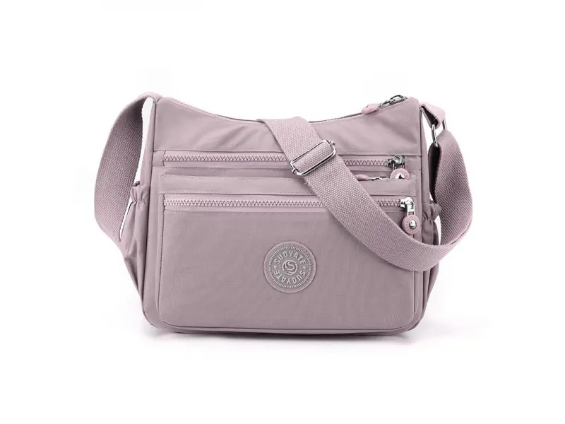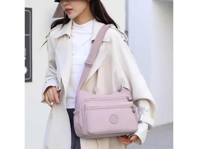 Дамска чанта в цвят пепел от рози - Дамска чанта от текстил. - Едно основно отделение с цип. - Три предни джобчета с цип. - Заден джоб с цип. - Два странични джоба. - Малък вътрешен джоб с цип. - Отделение за телефон и документи. - Регулираща се, дълга дръжка.