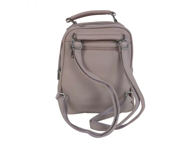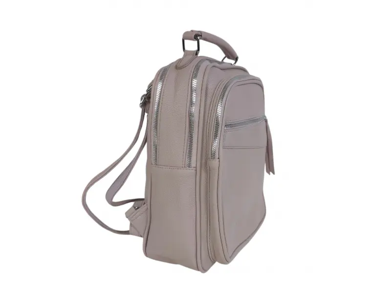 Голяма дамска раница - Дамска раница от еко кожа. - Две основни отделения с цип. - Вътрешен джоб с цип. - Вътрешен джоб без цип. - Два предни джоба с цип. - Заден джоб с цип. - Дръжка за носене на рамо. - Дръжка за носене в ръка. - Регулиращи се презрамки.