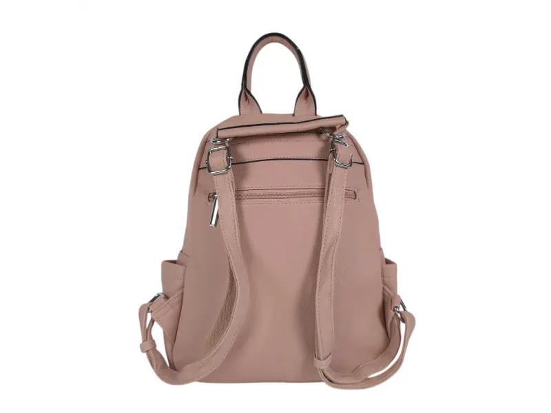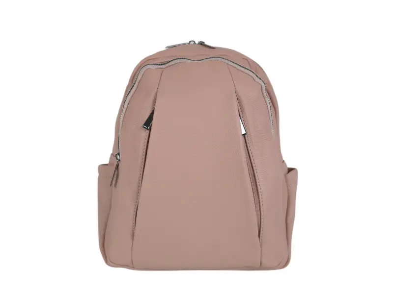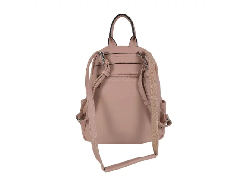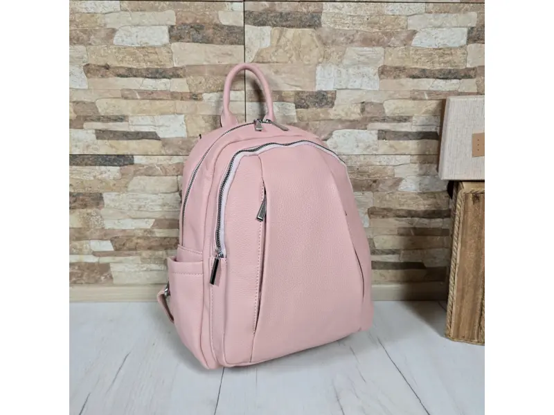 Розова дамска раница - чанта за ежедневието - Дамска раница от еко кожа. - Едно голямо отделение с цип. - Вътрешен джоб с цип. - Отделение за ключове и документи. - Три предни джоба с цип. - Заден джоб с цип. - Два странични джоба. - Дръжка за носене в ръка. - Регулиращи се презрамки.