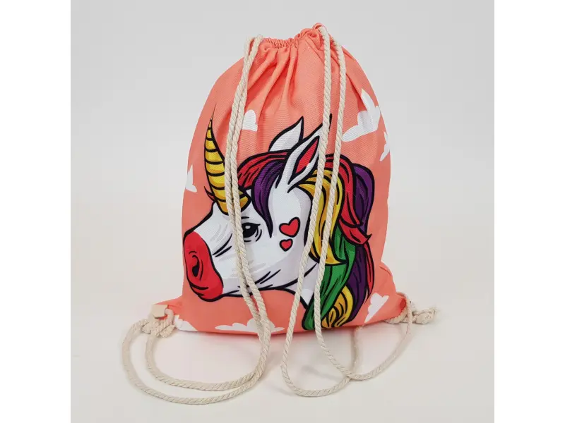 Качествена мешка с еднорог. Розова мешка подходяща за момичета и деца с едно отделение пристягащо се с въжени презрамки.