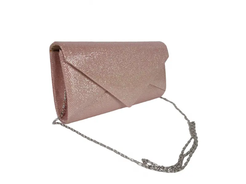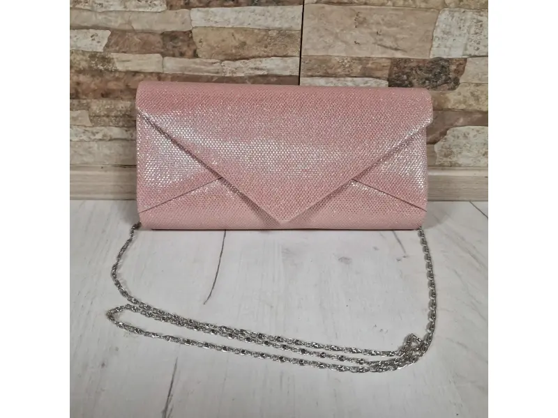 Елегантна чанта в розов цвят - Официална дамска чанта с едно отделение. - Отваряне и затваряне с копче тип магнит. - Дълга дръжка тип верижка в метален цвят.