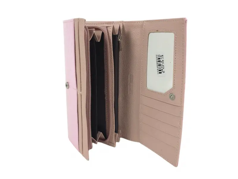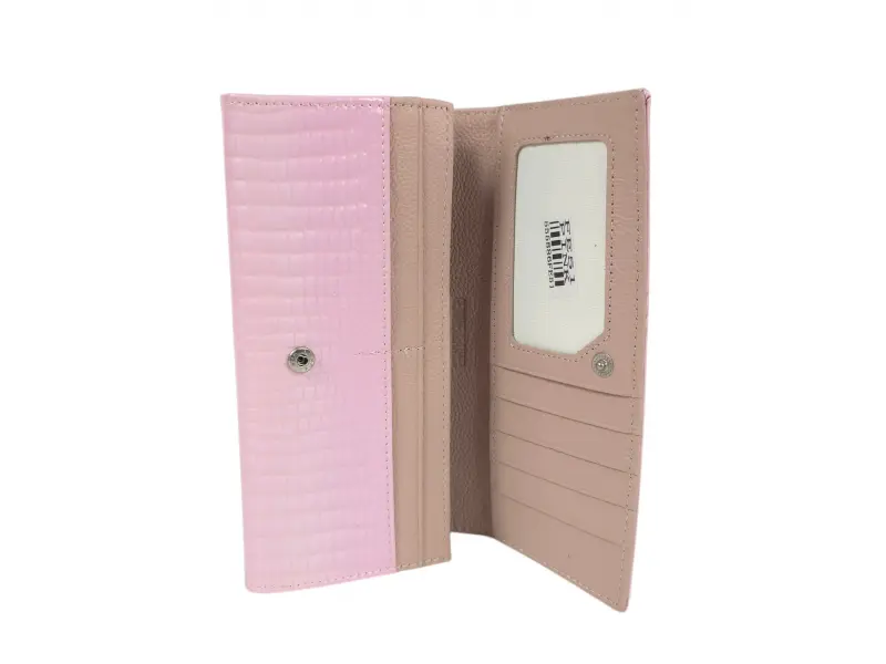 Бонбонено розово дамско портмоне - Дамско портмоне от естествена кожа и лак. - Закопчаване с копче тик - так. - Отделения за банкноти. - Две отделения с цип за монети. - Отделения за карти и лични документи.