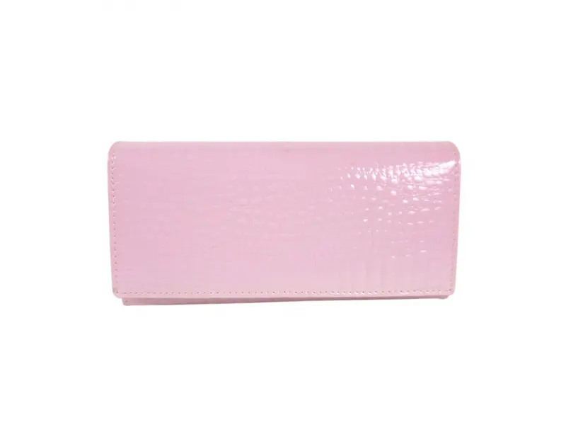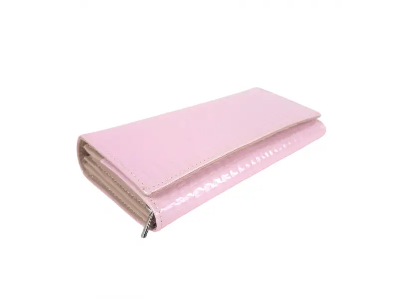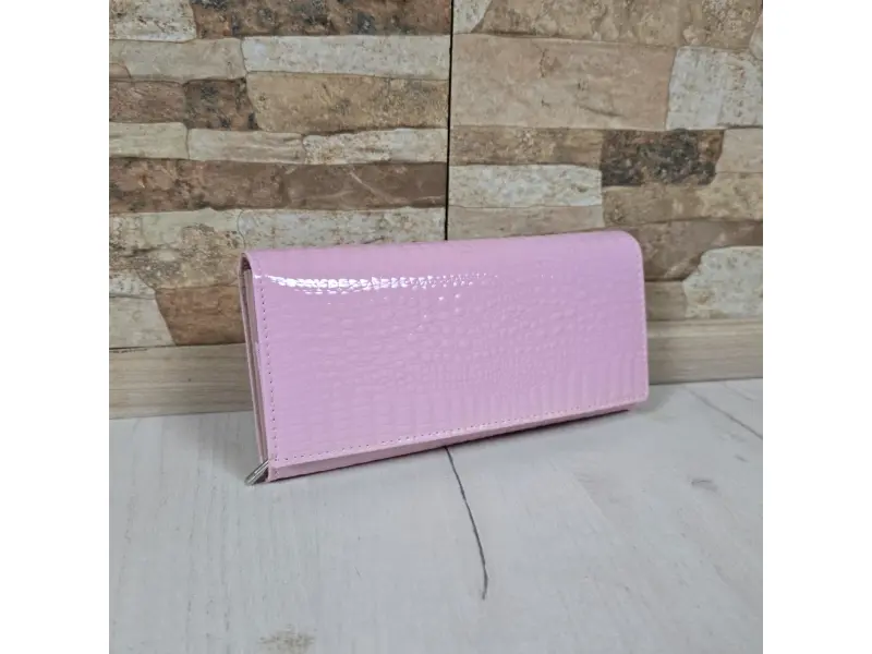 Розово дамско портмоне от естествена кожа и лак. Голямо дамско портмоне с отделения за банкноти, слотове за карти и лични документи и монетник с цип. Красиво дамско портмоне с интересен дизайн.