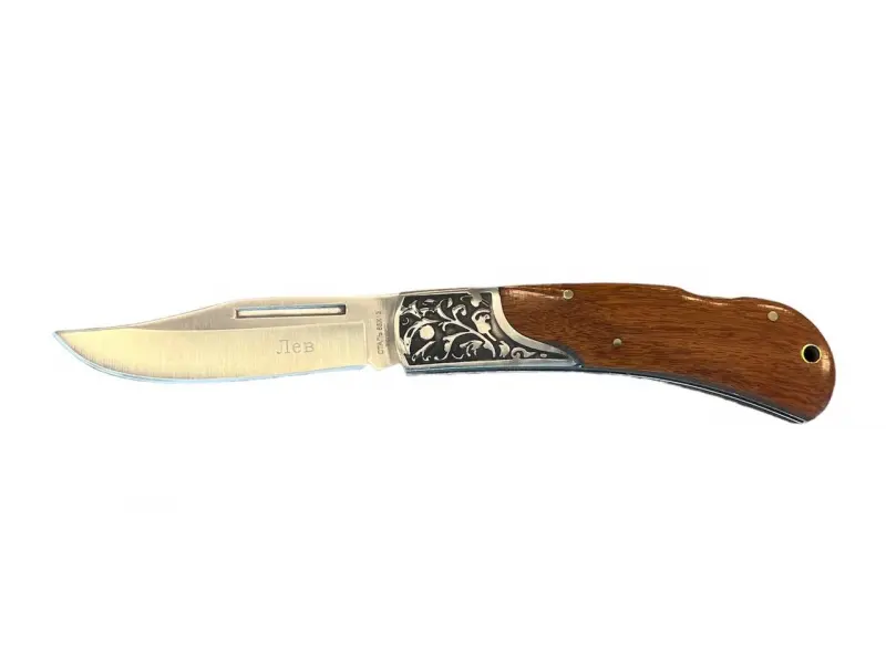Руски сгъваем ловен нож ЛЕВ е създаден за ценителите на прецизността, здравината и класическия дизайн. Изработен от висококачествена стомана 65х13, този нож гарантира устойчива острота и надеждност при всякакви условия – от лов и риболов до къмпинг и ежедневна употреба. Гравираната дръжка от стомана и орехови чирени придава уникален стил и осигурява сигурен и удобен захват.