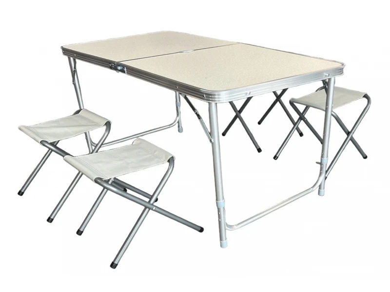 Компактна сгъваема маса с 4 стола – регулируема височина, алуминиева конструкция и без нужда от сглобяване. Идеална за пикник, къмпинг и риболов.