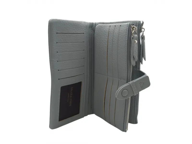 Атуално дамско портмоне с интересен дизайн от качествена изкуствена кожа. Практично дамско портмоне с удобни отделения за банкноти, карти и монети. Голямо дамско портмоне с тик-так закопчаване.
