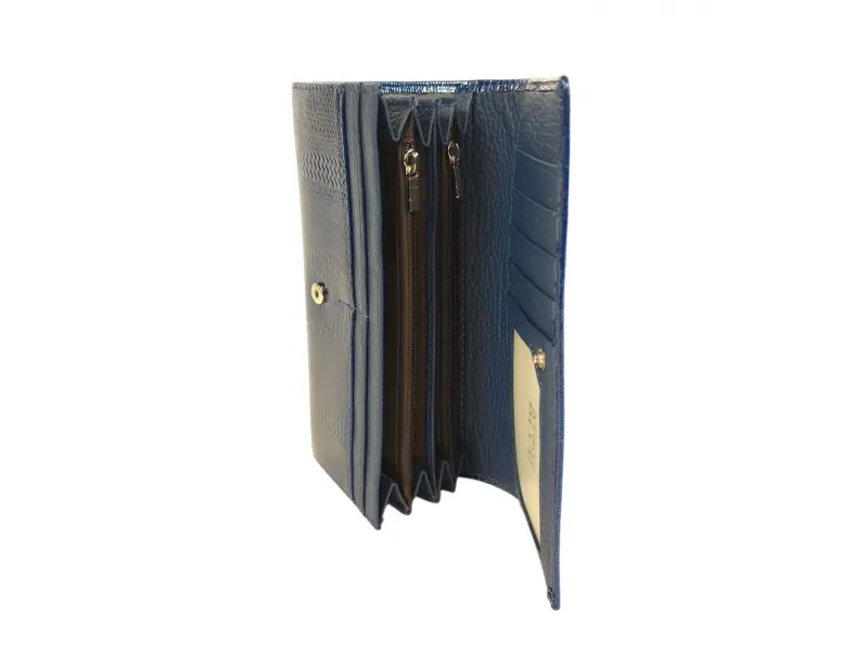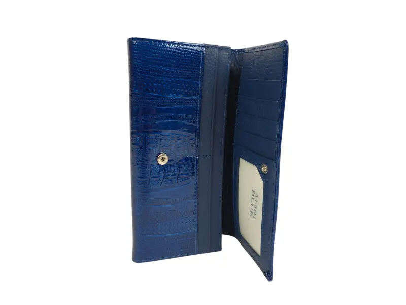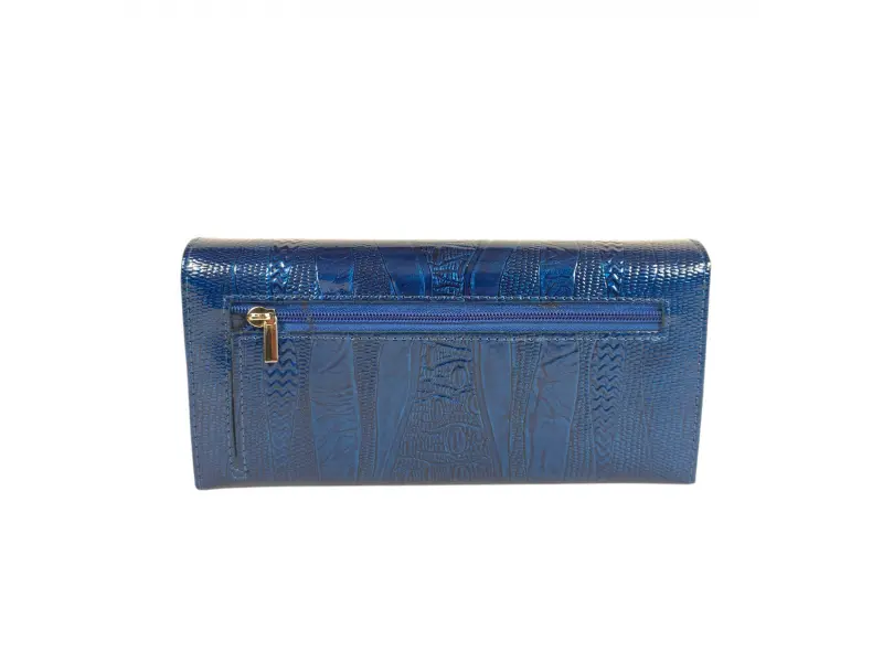 Синьо лачено портмоне - Дамско портмоне от естествена кожа и лачено покритие - Отделения за банкноти. - Две отделения с цип. - Отделения за документи - Заден джоб с цип. - Закопчаване с копче тик-так.