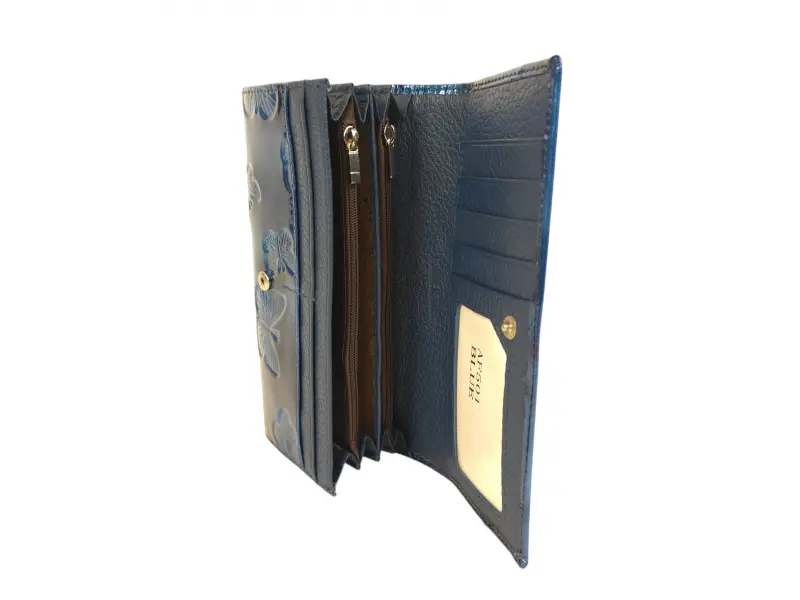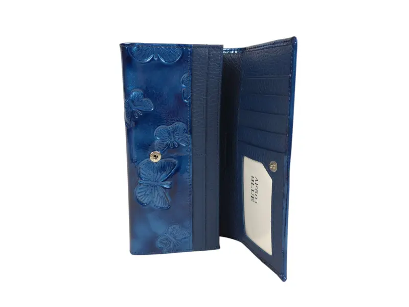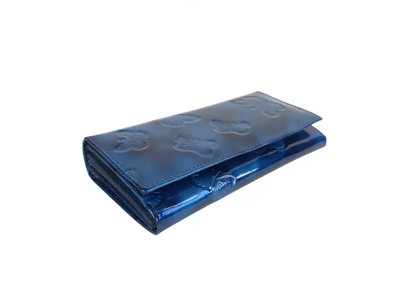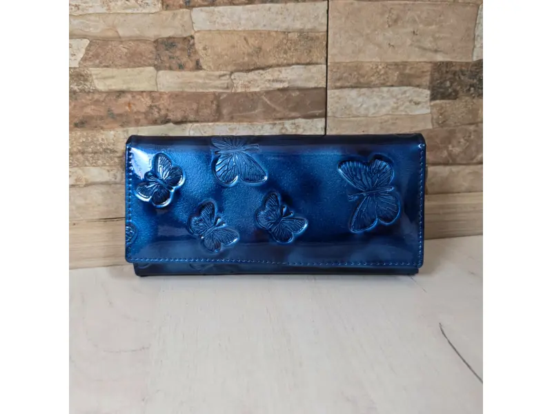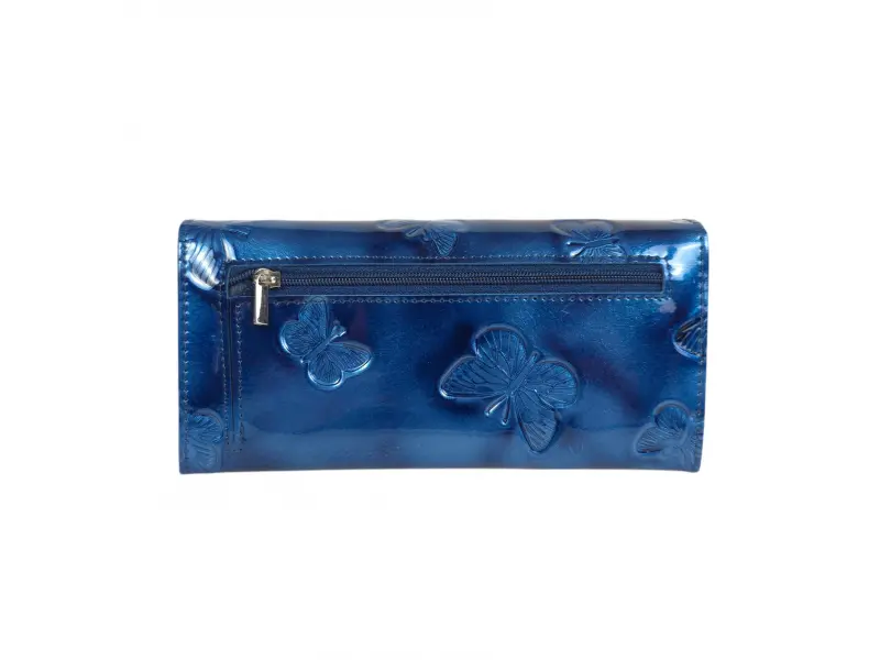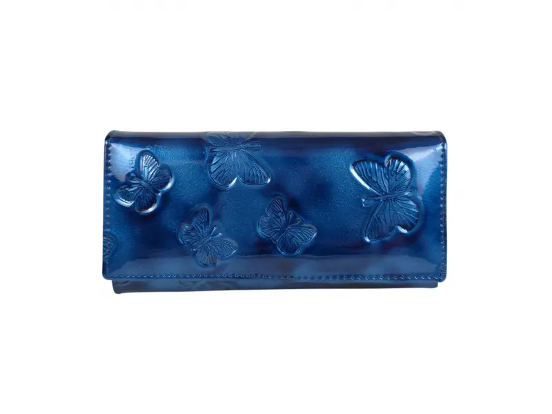 Синьо портмоне с лаково покритие - Дамско портмоне от естествена кожа и лачено покритие - Отделения за банкноти. - Отделение за монети с цип. - Отделения за документи - Задно джобче с цип. - Закопчаване с копче тик-так. - Разположението на пеперудите може да бъде различно.