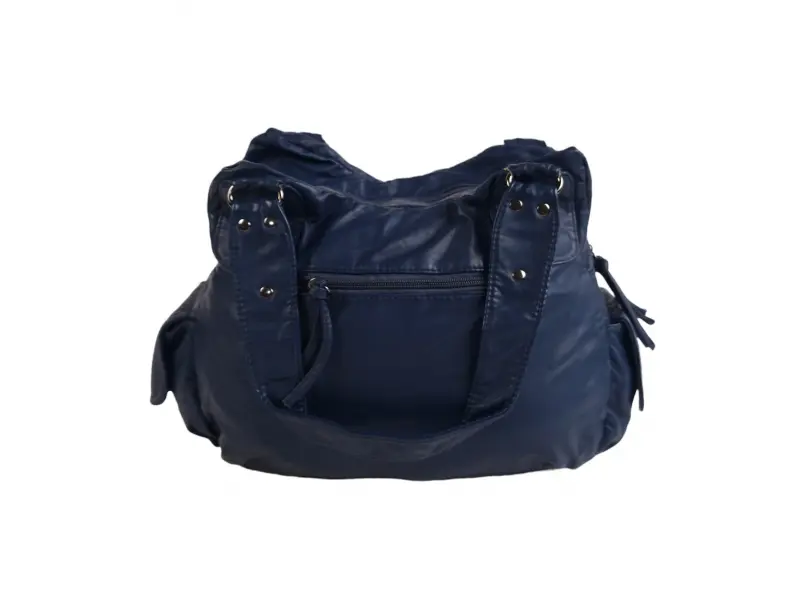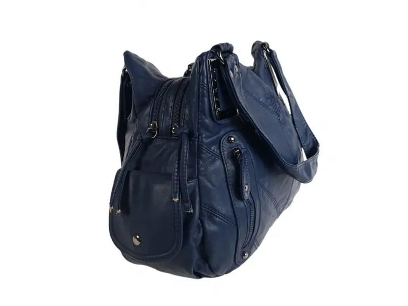 Мека на допир дамска чанта - Дамска чанта от варена кожа. - Две основни отделения с цип. - Малък вътрешен джоб с цип. - Отделения за телефон и документи. - Два предни джоба с цип. - Заден джоб с цип. - Два странични джоба. - Удобни дръжки за носене.