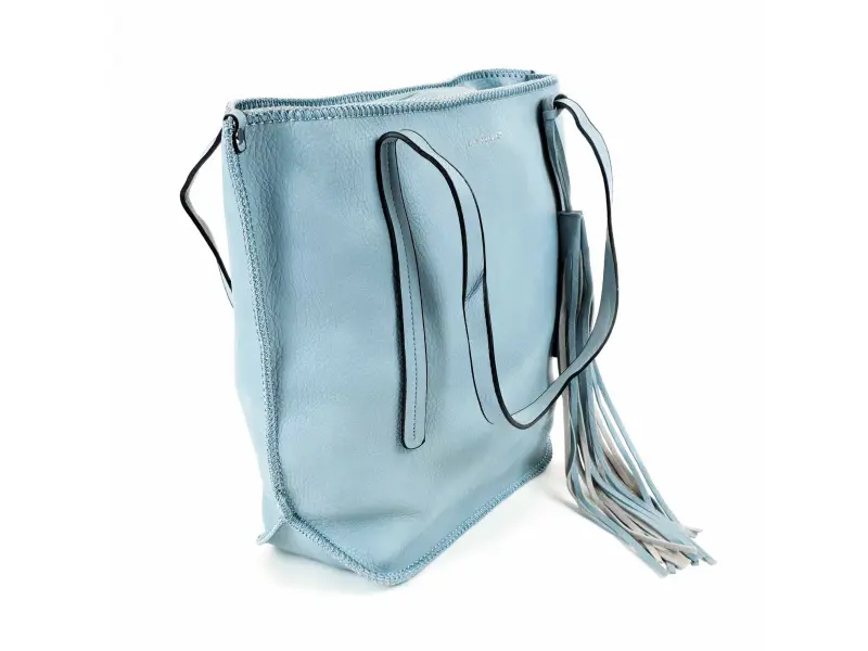 Голяма дамска чанта тип торба от качествена изкуствена кожа с интересен пискюл. Светло синя чанта с едно основно отделение с цип, малко вътрешно джобче без цип и дълги дръжки за носене.