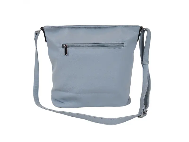 Удобна дамска чанта тип торба от качествена изкуствена кожа. Синя чанта с едно основно отделение с цип, малко вътрешно джобче с цип, преграда с цип, отделение за телефон или документи, два предни и един заден джоб с цип. Ежедневна чанта с удобна дълга регулираща се дръжка.