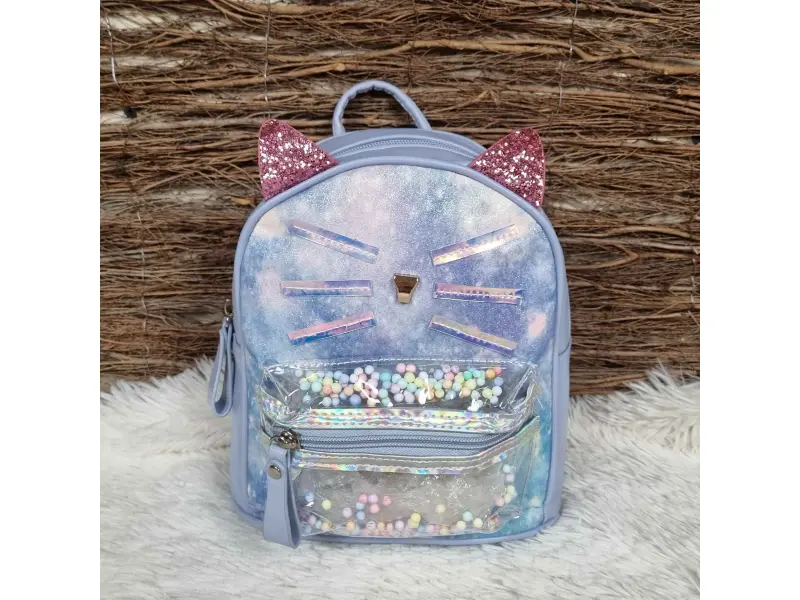 Удобна детска раница в син цвят - коте. Детска раница с едно голямо отделение затварящо се с цип, малко вътрешно джобче и преден джоб с цип. Раница с регулиращи се презрамки и дръжка за носене.