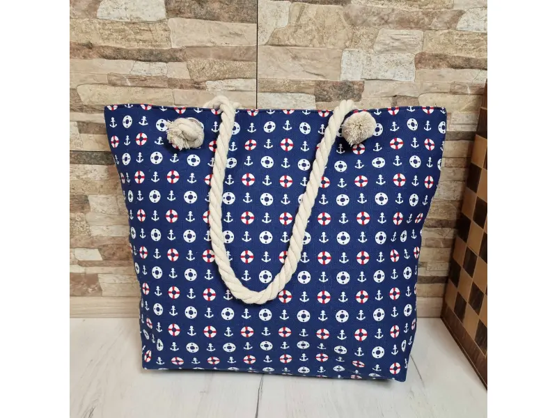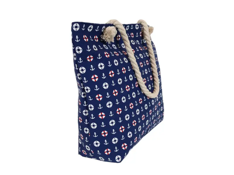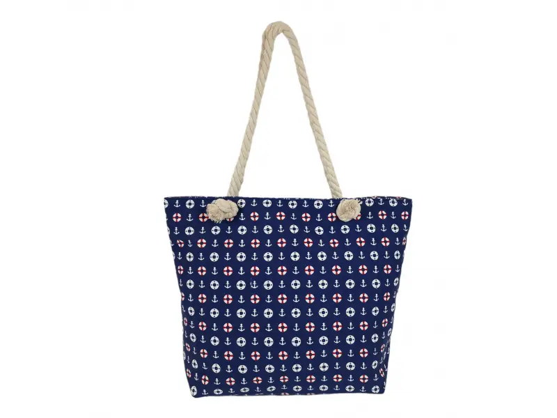 Синя плажна чанта с цип Удобна плажна чанта с едно отделение с цип и здрави въжени дръжки.