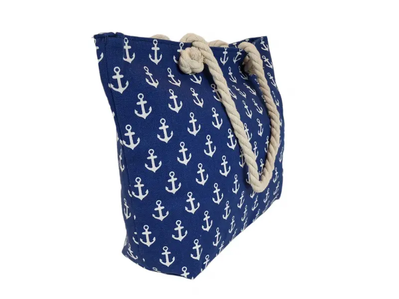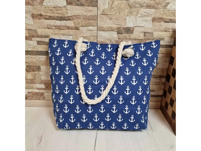 Чанта за плаж в син цвятУдобна плажна чанта с котви с едно отделение с цип и здрави въжени дръжки.