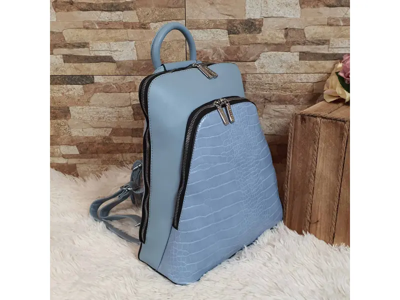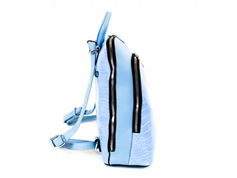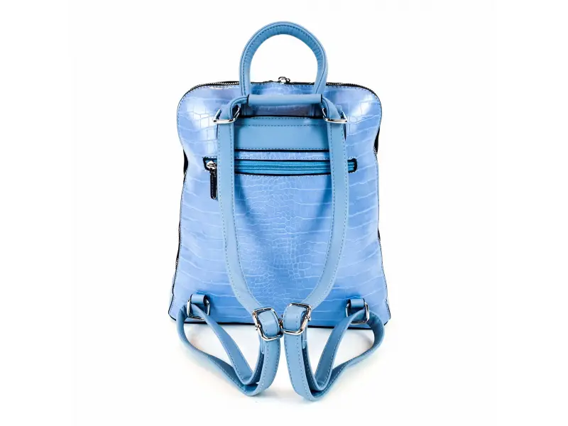 Интересна дамска раница изкуствена кожа, която може да се носи и като дамска чанта. Светло синя дамска раница с едно основно отделение с цип, малко вътрешно джобче с цип, място за телефон и документи, преден и заден джоб с цип. Модерна раница с удобни регулиращи се презрамки.