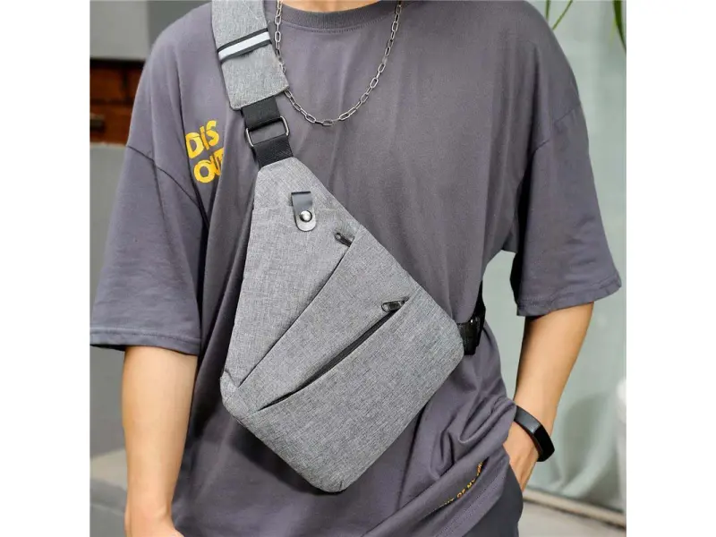 Тънка мъжка чанта от плат - Мъжка чанта, която може да се носи през гърди, рамо или гръб тип раница. - Едно основно отделение с цип. - Вътрешен джоб без цип. - Джоб с цип. - Два предни джоба с цип. - Преден джоб затварящ се с копче тип магнит. - Регулираща се презрамка.