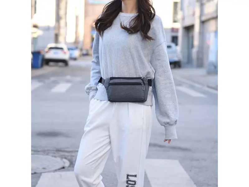 Тънка сива чанта за през кръста - Едно основно отделение с цип. - Два предни джоба с цип. - Заден джоб с цип. - Регулиращ се колан.