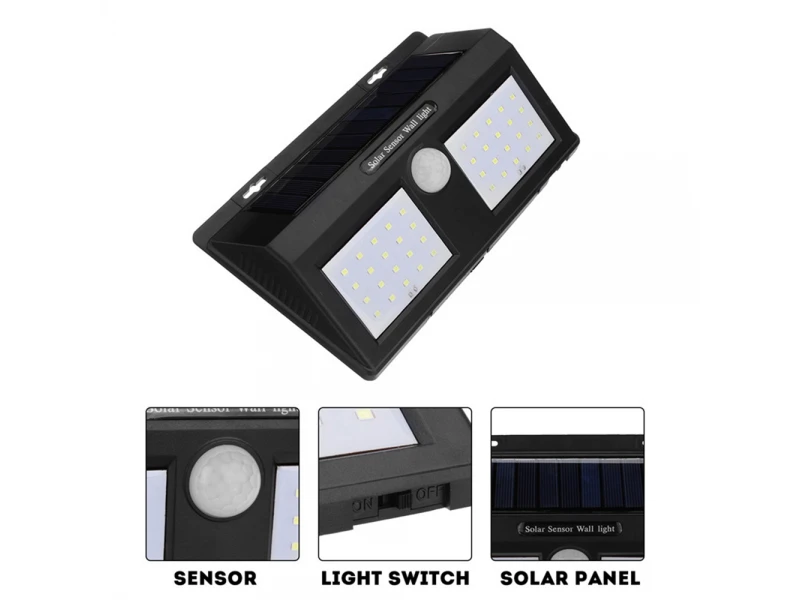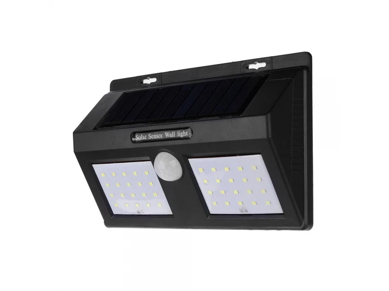 Соларен прожектор с 40 LED диода за стенен монтаж.Няма нужда от каквото и да е обслужване, просто монтирате на светло място и готово, без кабели, без смяна на батерии.Вградени 40 мощни и свърх ярки LED диода даващи наситена бяла светлинаВлаго и прахозащитена конструкцияАвтоматично включване и изключване при регистриране на движение / Светва ярка светлина при преминаване на човек в близост.Вградени 2 броя  Li Ion акумулаторни батерии с параметри 3.7V 1200mAh, общо 2400 mAhДатчика за движение се активира при движение в зоната на до 6-7 м от нея. Яркост на светлината в лумени: 640lmВреме на светене при движение - 25 сек.Соларен панел Чувствителен датчик за светлина, през деня не свети, колкото повече се стъмнява - толкова по ярко светят диодитеВреме за зареждане на слънчева светлина >8 часаПродължителност на светене при зареждане : 12 часаРазмери : 200х53х125 мм