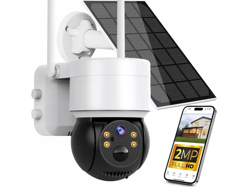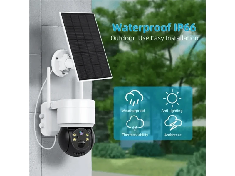 Тази камера за наблюдение предлага висококачествено 1080P Full HD изображение (1920x1080), което гарантира ясна и детайлна картина. Тя разполага с PTZ (панорамно, наклонено и зум) покритие, което позволява на камерата да се върти на 355° хоризонтално и 90° вертикално, осигурявайки пълен обхват на наблюдение.Основни характеристики: Резолюция: 1080P Full HD (1920x1080) за ясни и подробни изображения. PTZ покритие: Хоризонтално въртене на 355° и вертикално на 90°, за максимален обхват. Нощно виждане: Цветно нощно виждане с 12 бели светлини и 12 инфрачервени светлини, осигуряващи кристално ясна картина дори в тъмни условия. Зареждане: Соларен панел за възобновяема енергия, който осигурява постоянна работа без нужда от често презареждане. Откриване на движение: PIR сензор за движение и автоматично проследяване на обекти, осигурявайки сигурност и бързо реагиране на събития. Водоустойчивост: IP65 защита, която прави камерата устойчива на различни климатични условия, включително дъжд и прах. Аудио: Двупосочно аудио с вграден микрофон и високоговорител за лесна комуникация през камерата. Свързаност: 2.4 GHz WiFi свързаност, осигуряваща стабилна интернет връзка (не поддържа 5GHz). Съхранение: Поддръжка на карта с памет до 128GB и облачно съхранение, осигуряващо достатъчно място за запис на видео. Приложение: ICSEE приложение за дистанционно управление и достъп през мобилни устройства (iOS/Android).Приложение: Идеална за външни и вътрешни пространства, тази камера предлага надеждност и висока производителност за охрана на дома, офиса или бизнеса. Насладете се на спокойствие с високо качество на видео и аудио, осигуряващо сигурност и контрол в реално време.