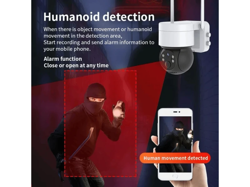 Тази камера за наблюдение предлага висококачествено 1080P Full HD изображение (1920x1080), което гарантира ясна и детайлна картина. Тя разполага с PTZ (панорамно, наклонено и зум) покритие, което позволява на камерата да се върти на 355° хоризонтално и 90° вертикално, осигурявайки пълен обхват на наблюдение.