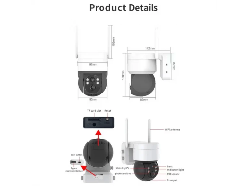 • Съхранение: Поддръжка на карта с памет до 128GB и облачно съхранение, осигуряващо достатъчно място за запис на видео.