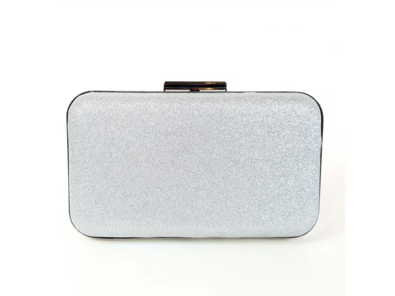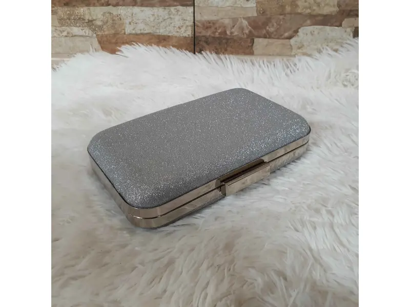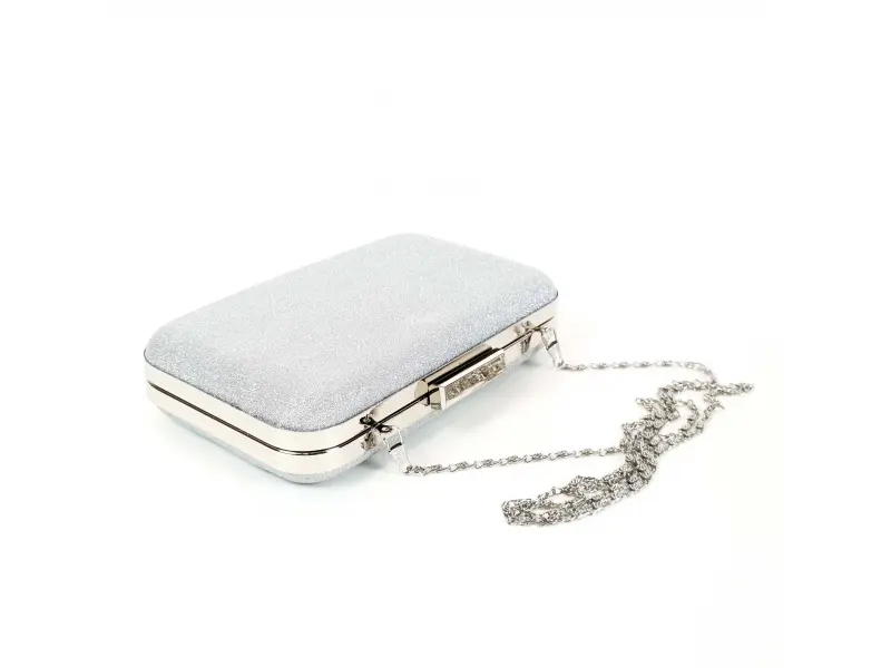 Стилна малка сребърна чанта със сребърен кант и верижка, едно отделение отварящо се с механизъм. Малка сребърна чанта подходяща за официална чанта, вечерна чанта или абитуриентска чанта.