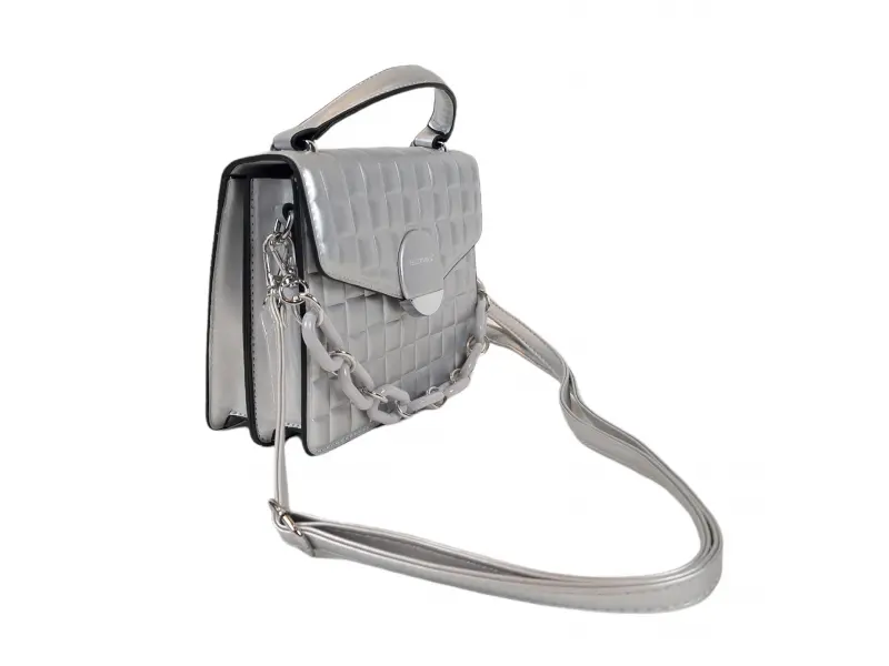Качествена малка дамска чанта от еко кожа Малка дамска чанта от качествена еко кожа. Сребърна чанта с едно основно отделение с цип и магнитно закопчаване, което се разделя на две от вътрешна преграда и малко вътрешно джобче без цип. Модерна чанта с удобна дръжка за носене в ръка, интересна дръжка тип верижка и допълнителна дълга регулираща се дръжка.