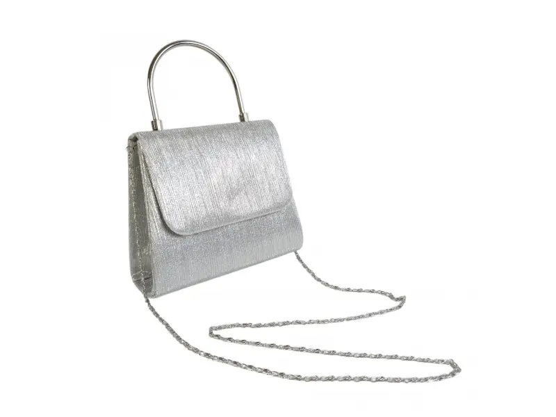 Сребърна чанта за официално събитие - Официална дамска чанта с едно отделение. - Отваряне и затваряне с магнит. - Дръжка за носене в ръка. - Дълга дръжка тип верижка.