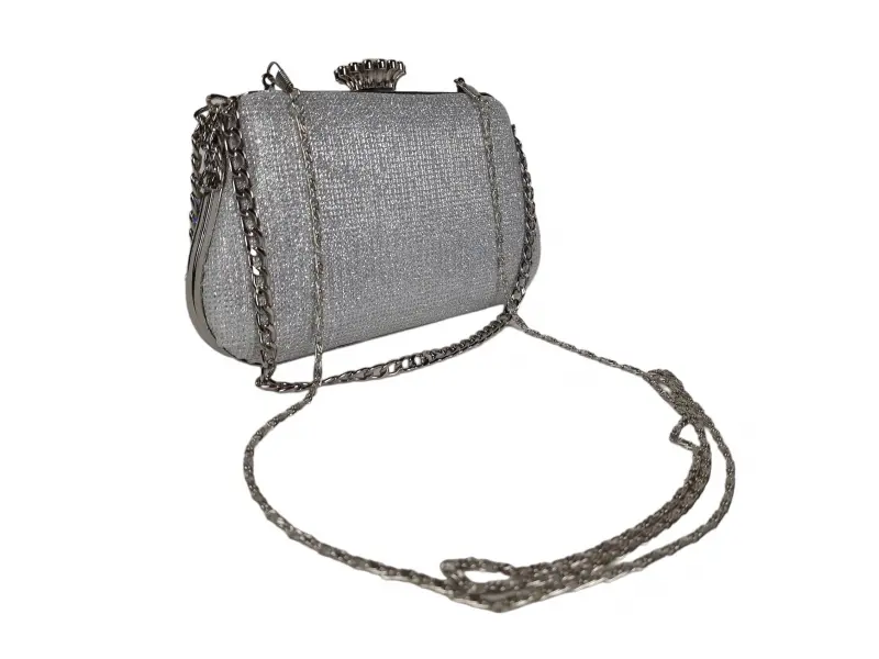 Малка чанта за абитуриентски бял - Официална дамска чанта с едно отделение. - Отваряне и затваряне с механизъм. - Сребърен кант. - Дръжка за носене в ръка. - Дълга дръжка тип верижка.