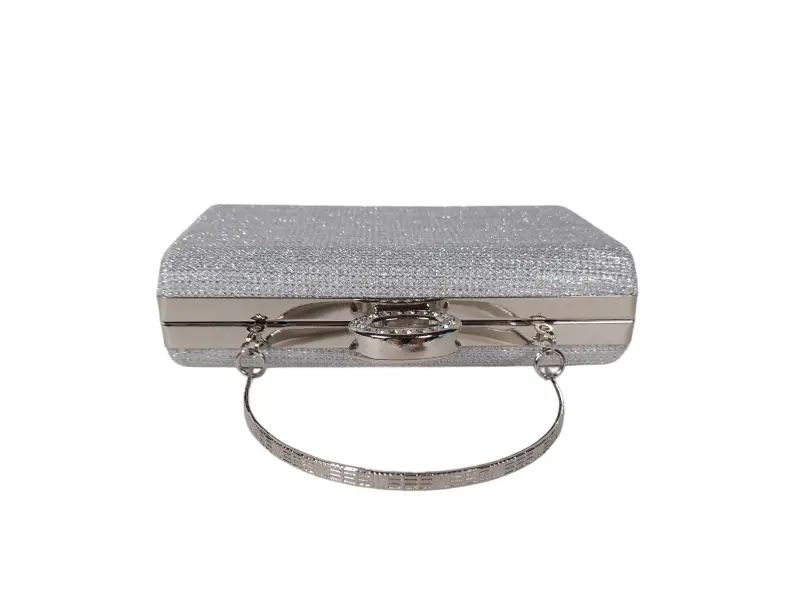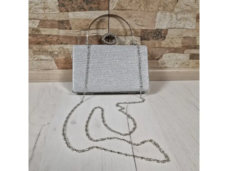 Сребърна чанта за абитуриентски бал - Официална дамска чанта с едно отделение. - Отваряне и затваряне с механизъм. - Сребърен кант. - Дръжка за носене в ръка. - Дълга дръжка тип верижка.