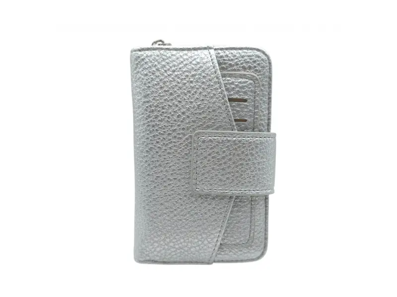 Сребърно дамско портмоне с интересен дизайн от качествена изкуствена кожа. Практично дамско портмоне с удобни отделения за банкноти, карти и монети. Малко дамско портмоне с тик-так закопчаване.