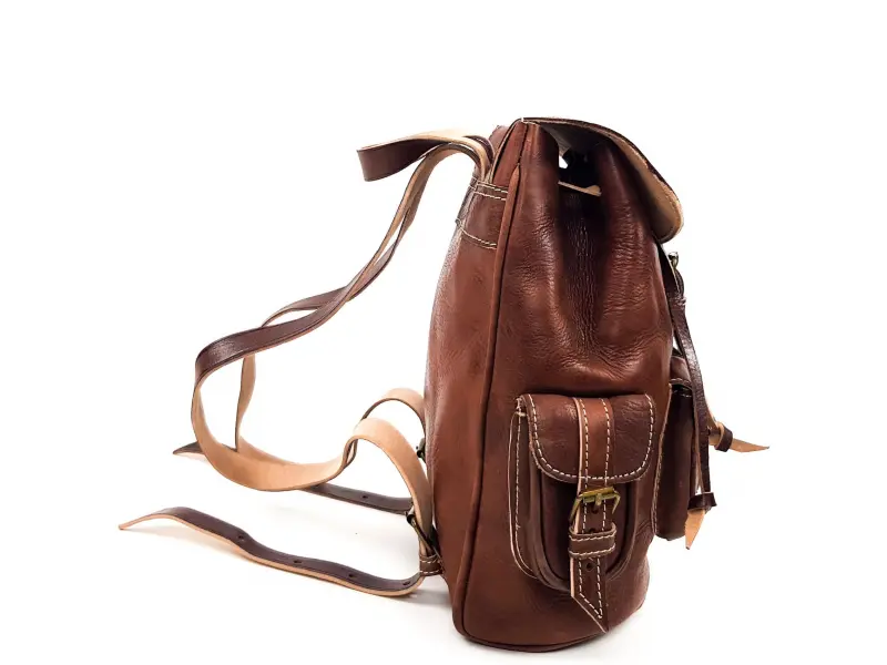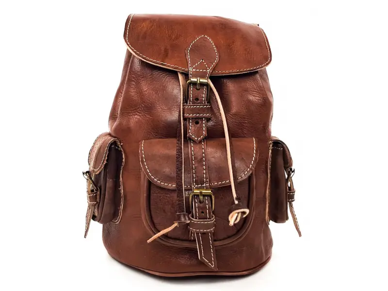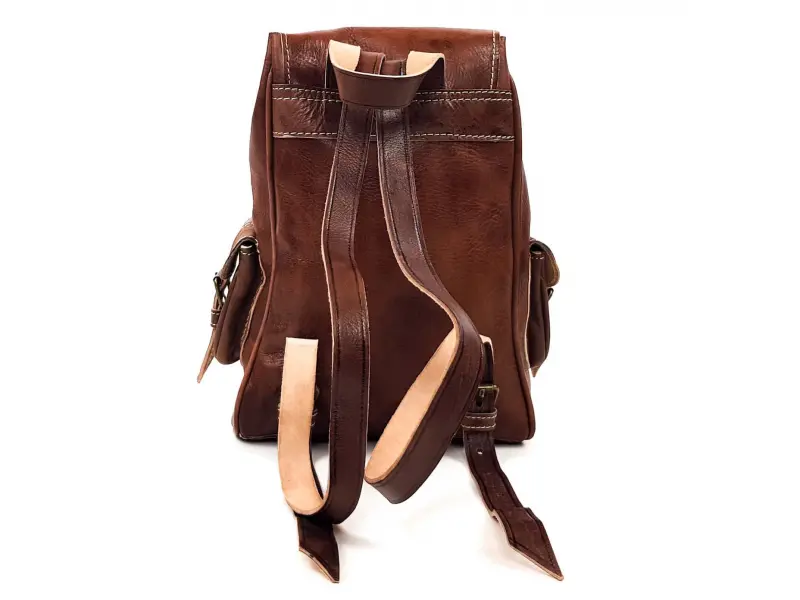 Качествена раница от естествена кожа произведена в Мароко , ръчна обработка на кожата при която не са ползвани химикали. Дамска раница от натурална кожа , раница тип мешка пристягаща се с кожени връзки , затваряне тип капак с колан и тока. Здрава и стабилна кожа в кафяв цвят , едно предно джобче , две странични джобчета , стабилни дръжки от кожа.