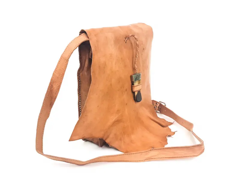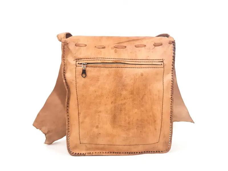 Дамска чанта от естествена кожа. Ръчна изработка на кожата. Интересна чанта от Мароко в светло кафяв цвят. Регулираща се дълга кожена дръжка. Затваряне с капак и зъб. Голямо отделение затварящо се с цип. Предно и задно отделение с цип.