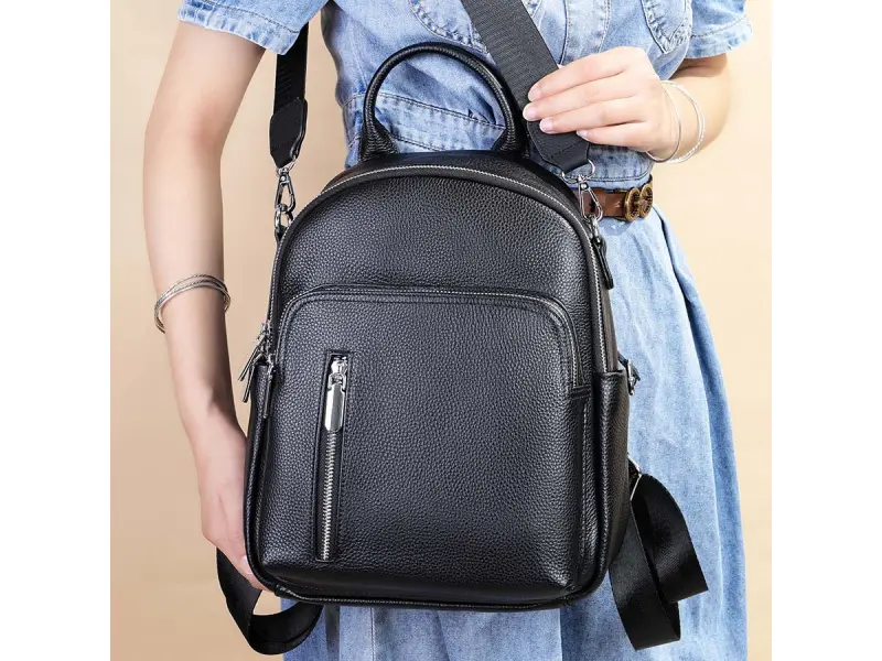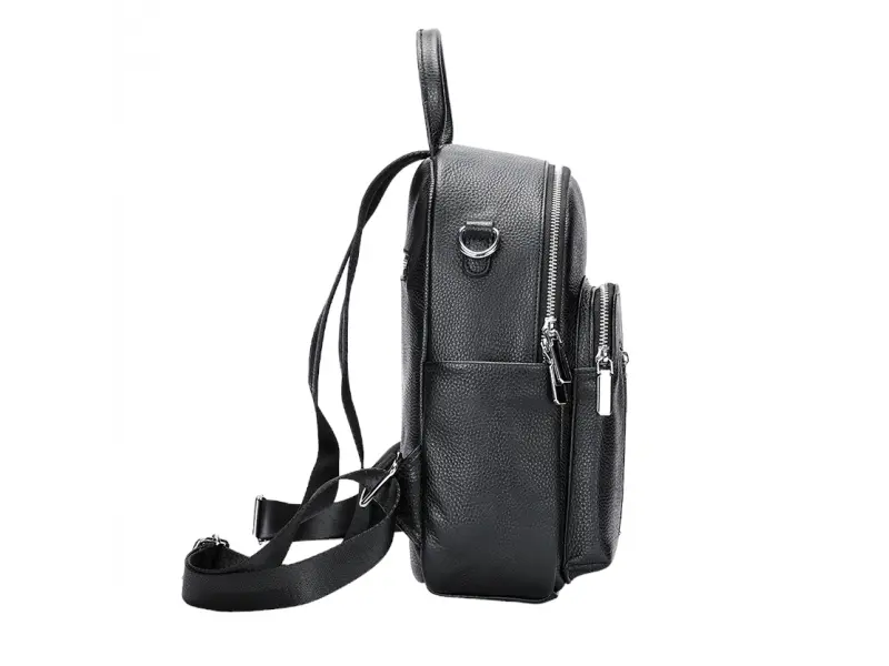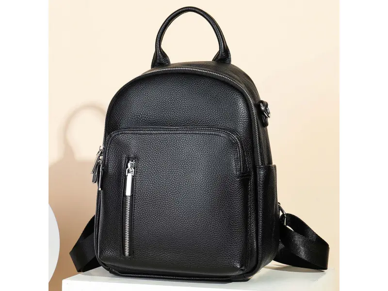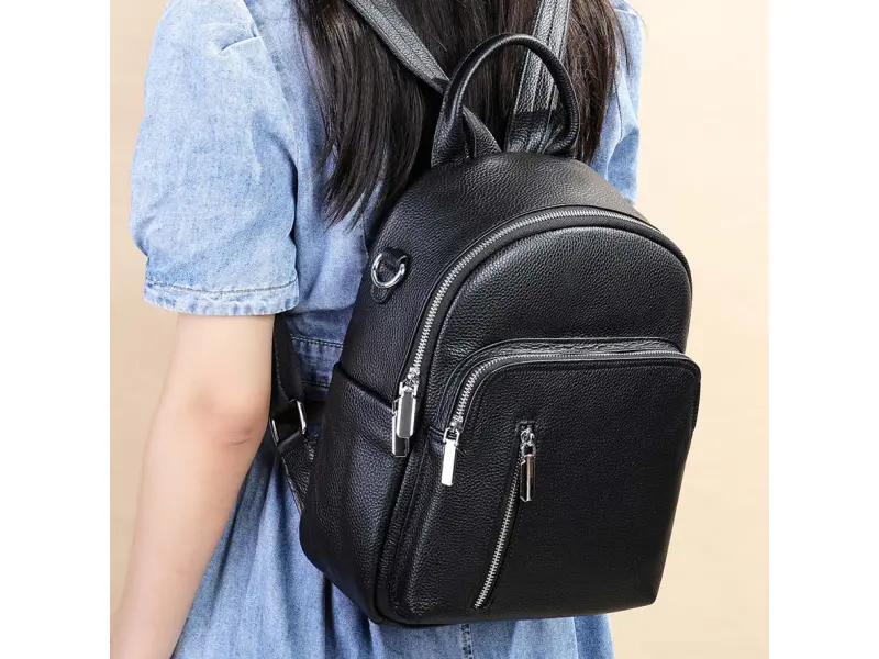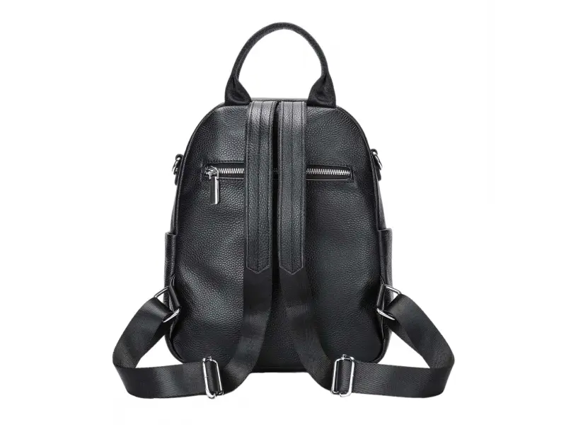 Интересен модел дамска раница - Дамска раница от естествена кожа. - Едно основно отделение с цип. - Две вътрешни джобчета с цип. - Две вътрешни джобчета без цип. - Два предни джоба с цип - Заден джоб с цип. - Два странични джоба. - Дръжка за носене в ръка. - Допълнителна дръжка за носене като чанта. - Регулиращи се презрамки.