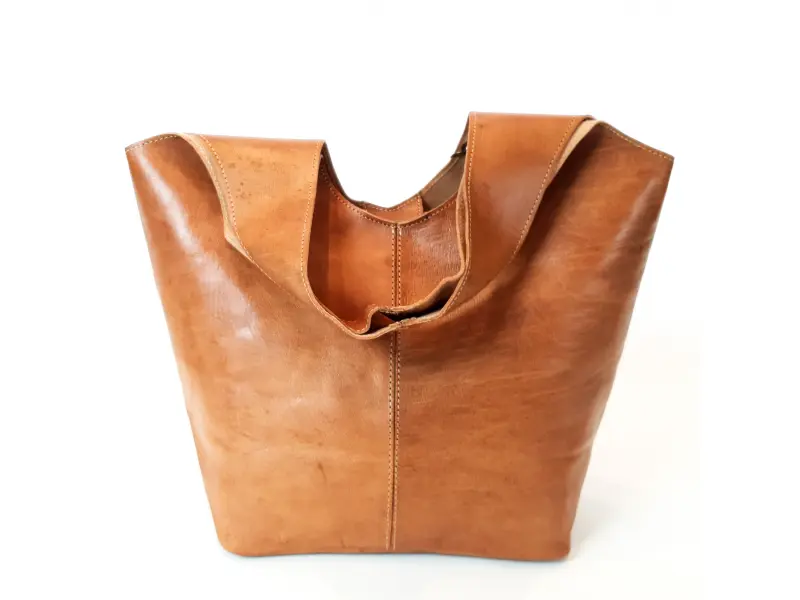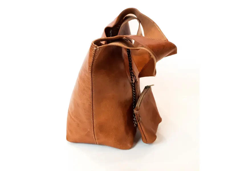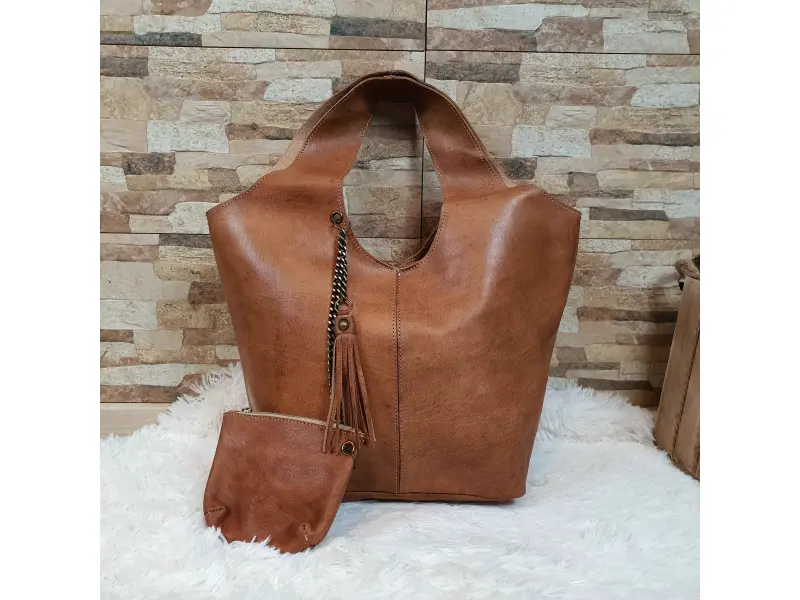 Голяма дамска чанта тип торба от естествена кожа, ръчно обработена. Мароканска чанта - торба с магнитно закопчаване, със здрави дръжки и допълнително портмоне с цип.