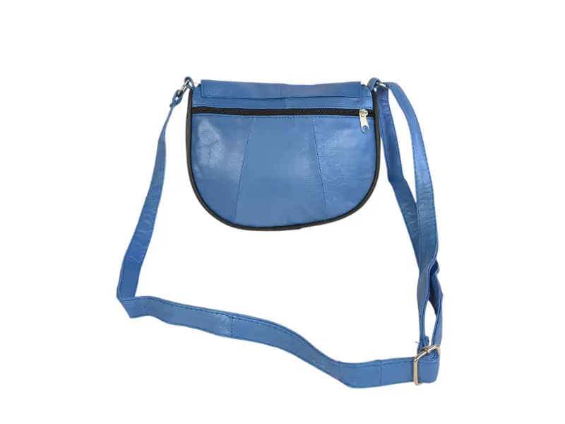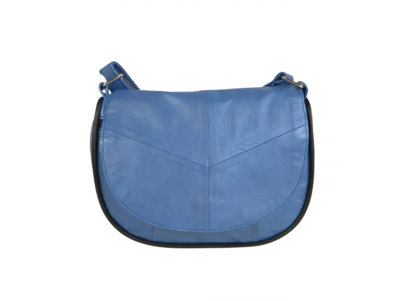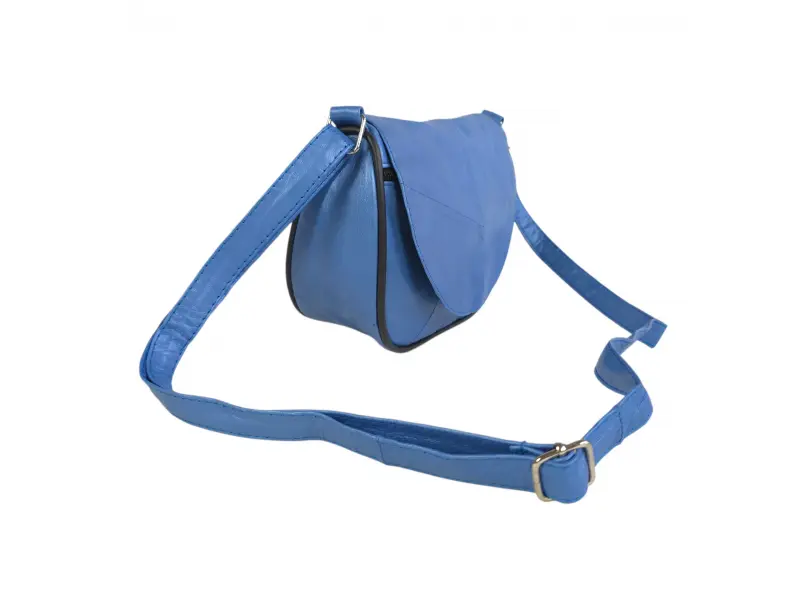 Малка синя дамска чанта с капак - Дамска чанта от естествена кожа. - Едно основно отделение с цип и капак с магнитно закопчаване. - Малко вътрешно джобче с цип. - Преден джоб под капака с цип. - Заден джоб с цип. - Регулираща се се дълга дръжка.