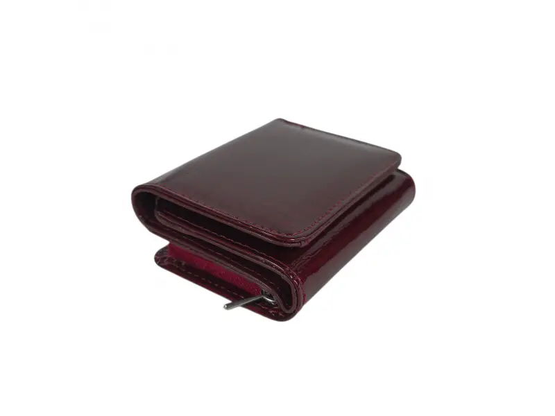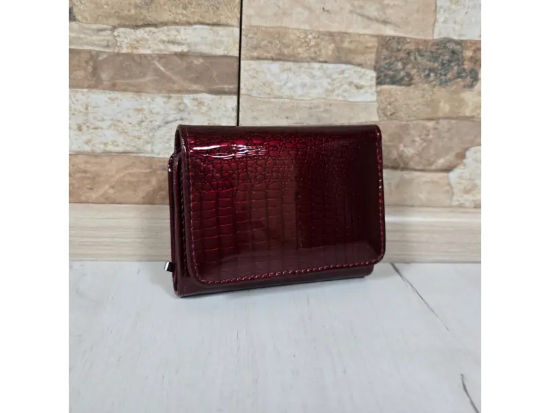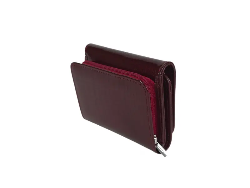 Малко лачено дамско портмоне с лаково покритие - Тъмно червено портмоне от естествена кожа и лак. - Затваряне с магнит. - Отделения за карти и лични документи. - Отделение за банкноти. - Монетник с цип.