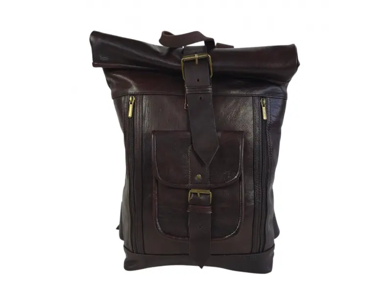 Голяма раница произведена в Мароко - Раница от качествена естествена кожа. - Едно основно отделение затварящо се с кожен колан. - Вътрешен джоб с цип. - Два предни джоба с цип. - Преден джоб затварящ се с колан. - Заден джоб с цип. - Дръжка за носене в ръка. - Регулиращи се презрамки.