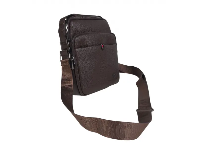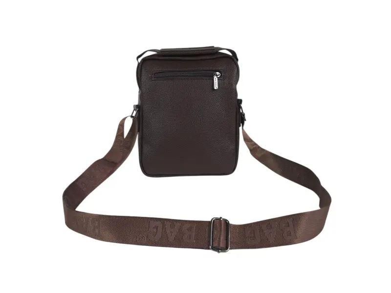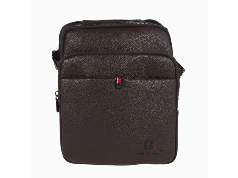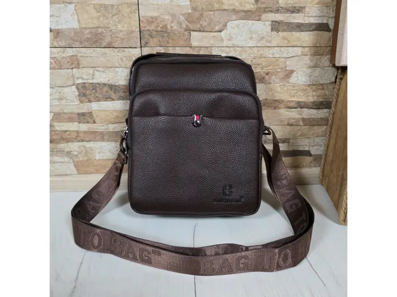 Мъжка чанта с модерен дизайн -Мъжка чанта от качествена еко кожа в тъмно кафяв цвят. -Едно основно отделение с цип. -Вътрешен джоб с цип. -Преден джоб с цип. -Преден джоб без цип. -Заден джоб с цип. -Дръжка за носене в ръка. -Дълга регулираща се дръжка.
