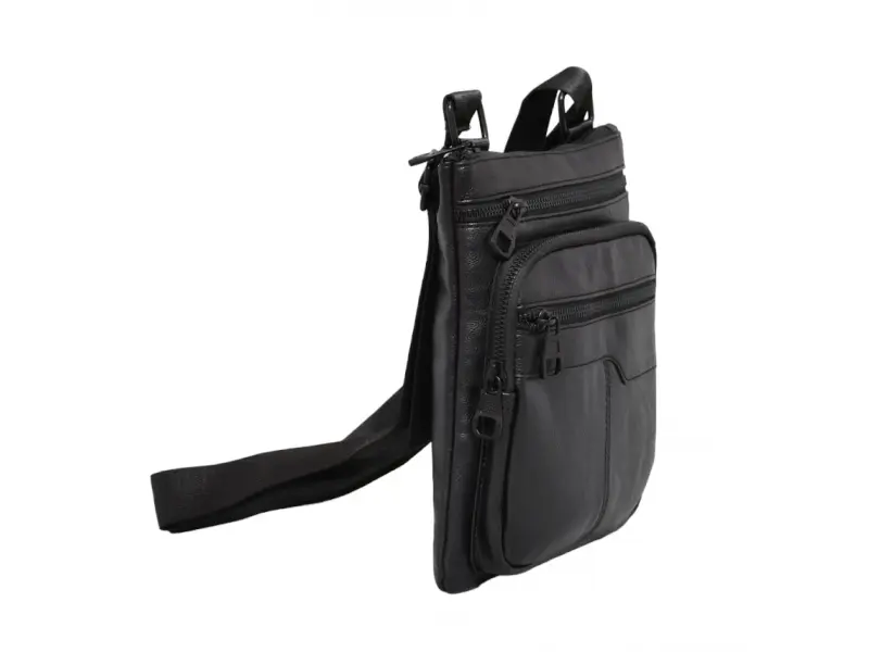Компактна мъжка чанта за през рамо - Мъжка чанта от еко кожа. - Едно основно отделение с цип. - Три предни джоба с цип. - Заден джоб с цип. - Дълга, регулираща се дръжка.
