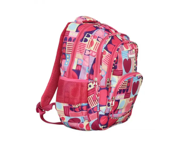 Интересен модел раница с принт на сърца - Красива раница за училище или спорт. - Едно основно отделение с цип. - Три предни джоба с цип. - Странични отделения за бутилки. - Дръжка за носене в ръка. - Регулиращи се презрамки.