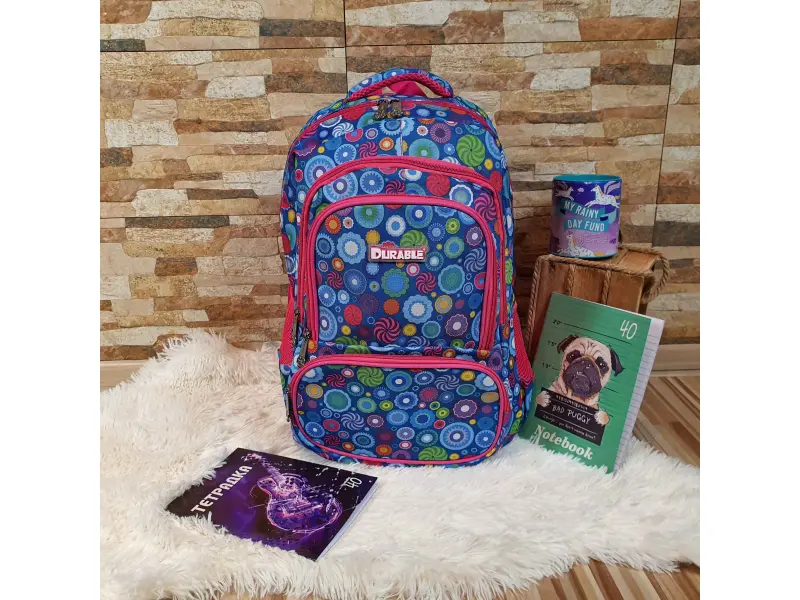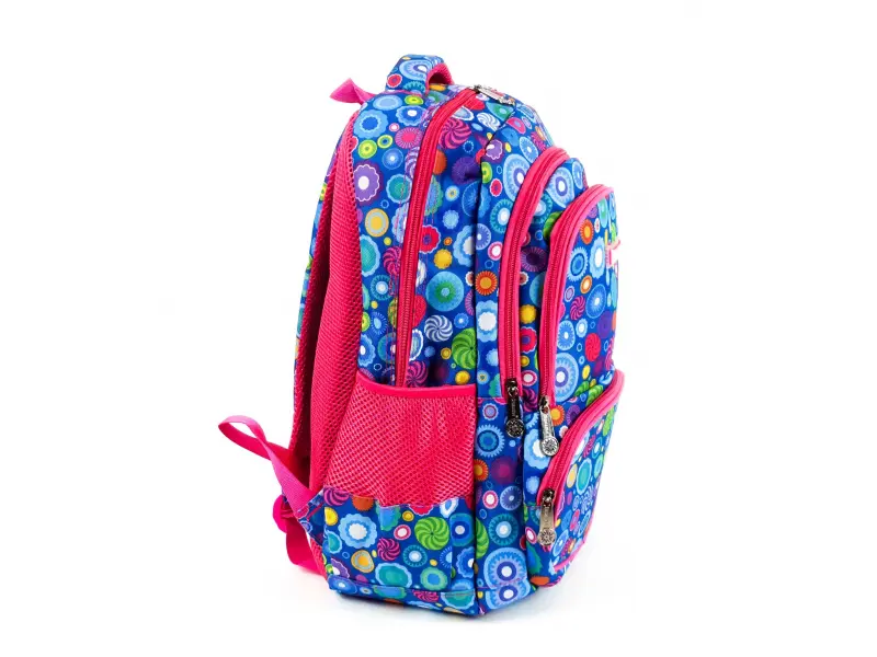Ученическа раница подходяща за момиче с удобен гръб и регулиращи се презрамки. Раница с две големи отделения и две предни джобчета, странични мрежи за бутилки, здрава дръжка за носене и дръжка за закачане.