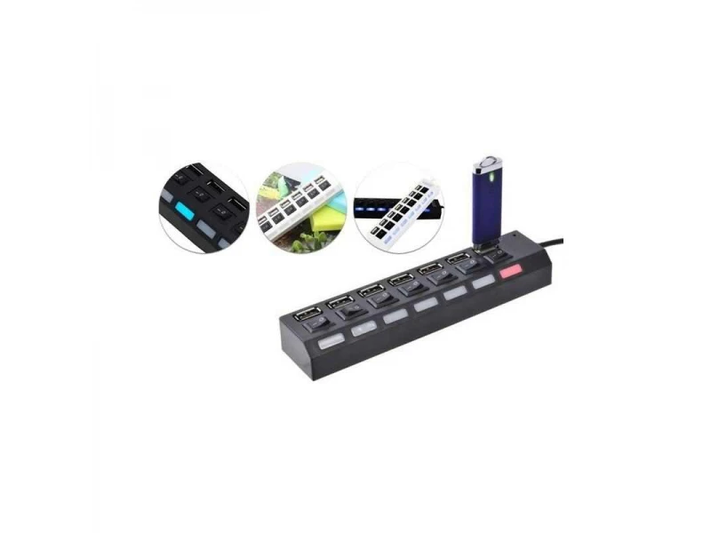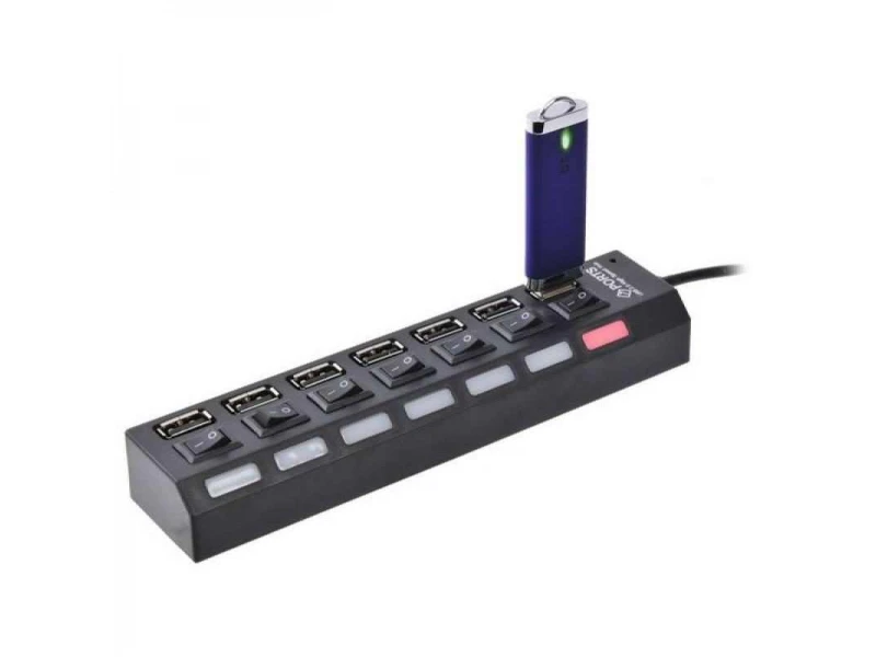 Универсален USB 2.0 хъб / разклонител с 7 порта за USB устройства. Всеки порт притежава собствено копче за включване и изключване