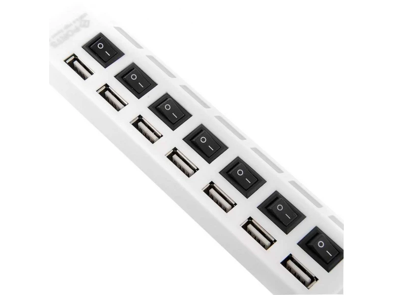 USB разклонител със 7 активни портаВсеки порт притежава собствено копче за включване и изключване.7 LED индикатора показващ статуса на хъбаЗащита от претоварванеВисока скорост на трансфер, над 480MbpsИнтерфейс: USB 2.0, USB 1.1Възможност за допълнително захранване с адаптер 3.5 mm 5V/1A ( не е включен )Дължина на USB кабела: 54см.Размери на порт хъба: 165х31х23мм.Цвят: Черен и бял