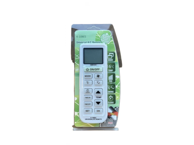Универсално дистанционно управление за климатик с 108 кода и таймер. Дистанционното управление е подходящо за следните марки климатици: Acson, Adc, Aidelong, Aite, Akira,Amcor,Amico, alpin, Aucma, Aux, Aoke, Aoli, Apton, Baixue,Beijingjingdian, Big-Thumb, Boerka, Boshi, Boshigao,Borler, Caixing, Carrier, Chagfeng, CHANGFU, cHANGLING, Changhong, Chengyuan, Chuanghua, Chuanyan, Chigo, Chunlan, Colrolla,Corona, Crown, Daewoo,Daikin, Dajinxing, Dake, Daotian, delonghi, Dunan,Dongxia, Dongxinbao, Elco, Electer, Electrolux, Fedders,Feiedrich, Feige, Feilu, Ferroli, first, frestech, Fujitsu, galanz, Geer, Glee, Goldstar,Gree, Guangda, Guqiao, Haier, Helton, Hemilton, Hicon,Hisense,Hitachi, Hongyi,Huabao,Huagao, Huake, Huamei, Huanghe, Hualing, Huawei, Huifeng,Hyundai, Inycin,Jiangnan, Jiale, Jimstar, Jinbeijink, Jinda, Jinsong, Johnso, Kangli, Kelong, Klimatair,Konka, Kris, Kt02_D001, Kt02_D002, Kty001,Kty002,Kty003,Kty004,Kty005, LG, Liangyu, Likeaie, Littleswan, Longhe, Loren-Sebo, Mcquay, Md, Meiling, Mingxing, Mitsubishi, Mitsuka, National, Nikko, Niso, Norka, Olympus, Opal, Panda, Pereg, Pinshang, Pilot, Puyi, Qixing, Raybo, Rhoss, Ricai, Rijiang, Rowa, Sacon, Samsung, Sanyo Nec, Sanzuan, Saporo, Sast, Sensor, Serene, Shamei, Shangling, Shanye, Shanxing, Sharp, Shenbao, Shengfeng, Shengfeng/feilu, Shinco, Shining, Shuanglu, Sigma, Sogo, Songlinxia, Songxing, Sova, Sowa, Soyea, Speed, Srtc, Staright-aircon, Sunburg, Tadiair, Tadiran, Taiya, TCL, Teac, Teco, Tianjinkongtiao, Tianyuan, Tobo, Tongli, Toyo, Toshiba, Trane, Uni-air, Uttleduck, Wanbao, Wangzi, Weili, Weiteli, Whirlpool, Wufeng, Xinghe, Xinle, Xinling, Xileng, Xiongdi, Yair, Yaoma, Yidong, York, Yutu, Zapaizuzhuangji, Zhongyi, Zuodan и др.