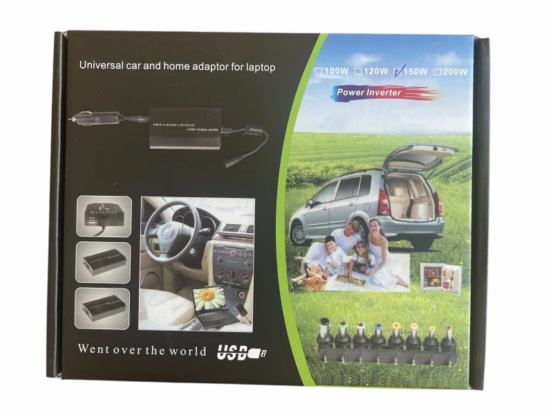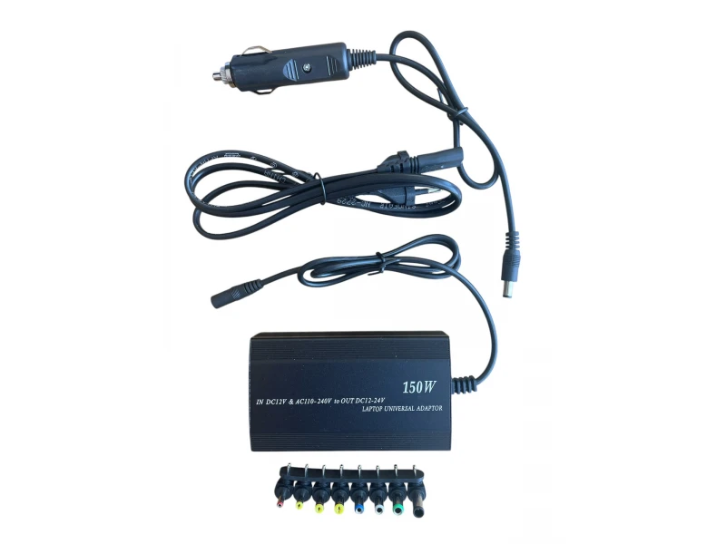 Мултифункционално зарядно 150W с USB порт, 8 сменяеми щепсела и защита срещу претоварване. Работи с 12V DC и 110–240V AC – идеално за дом и кола.
